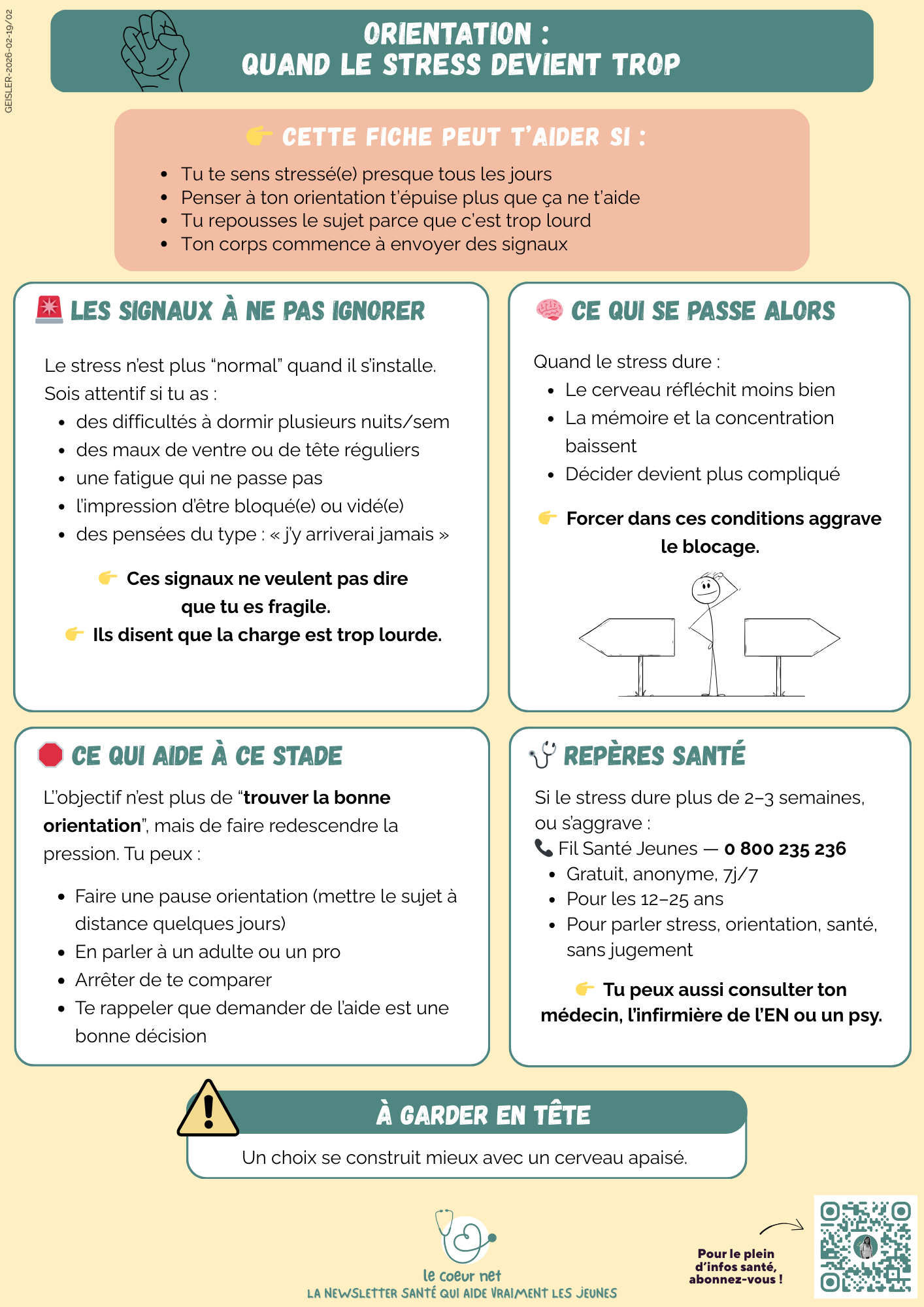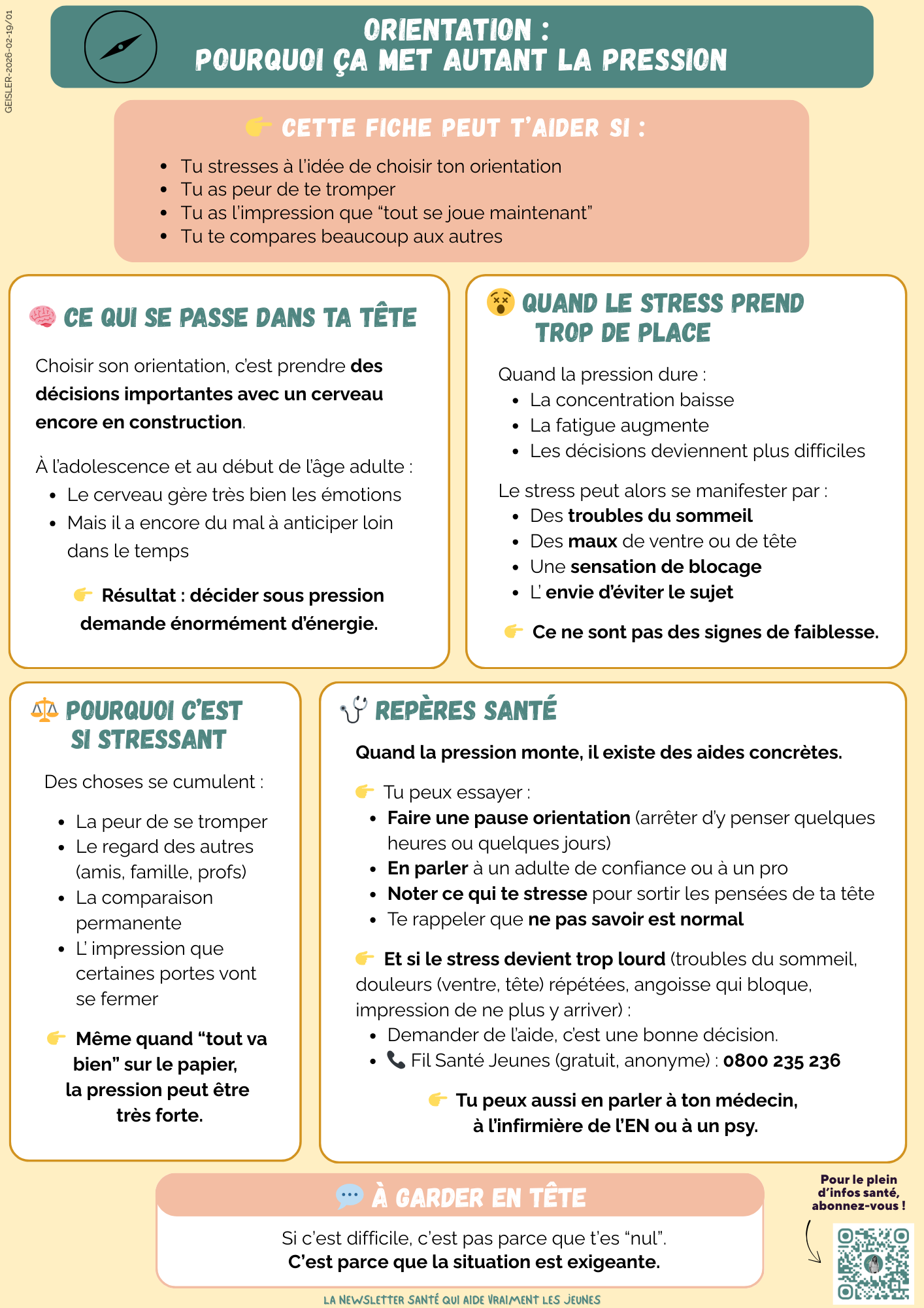 Choisir son orientation, c'est pas juste cocher des cases ou remplir des dossiers. Que ce soit pour choisir sa filière au collège, ses spécialités au lycée ou ses études post-bac, dans la tête des ados, ça tourne à fond : le cerveau qui doit décider alors qu'il n'a pas fini de se construire, il peut y avoir la peur de se planter devant tout le monde, du stress qui s'accumule jour après jour. Résultat ? Leur santé mentale et physique trinque parfois. On vous explique ce qui se passe vraiment.